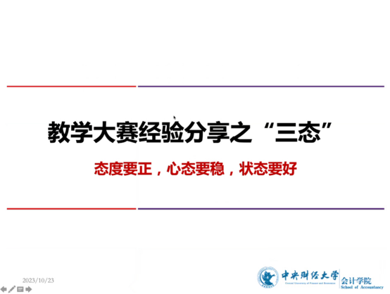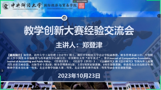 为进一步提升公司教师教学创新能力,提升课程教学质量,2023年10月23日晚,永利yl23411举办教学创新大赛经验交流会,会计公司财务管理系副系主任郑登津副教授应邀做了《教学创新大赛经验分享》的讲座,并与公司教师进行了深入交流。郑登津副教授是北京市高校青年教师教学基本功比赛一等奖、北京市教学创新大赛二等奖的获得者。讲座由永利yl23411副经理李瑞琴教授主持。