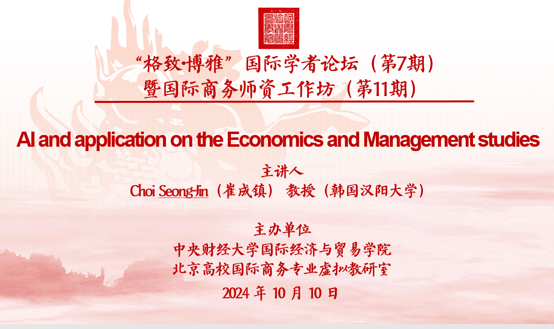 2024年10月10日,永利yl23411“格致·博雅”国际学者论坛(第7期)暨国际商务团队工作坊(第11期)在沙河校区图书馆地下一楼报告厅成功举办。论坛邀请韩国汉阳大学商公司Choi Seong-Jin(崔成镇)教授做了题为“AI and application on the Economics and Management studies”的精彩讲座。讲座由永利yl23411副经理段玉婉教授主持,胡增玺助理教授对讲座进行点评,公司师生共计80余人参与了本次讲座。
