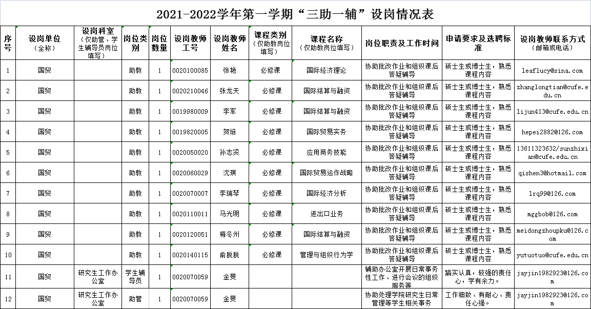 2021-2022学年第二学期“三助一辅”设岗情况详见下表所示,请符合申请条件的研究生在9月28日中午12点前根据设岗老师公布的联系方式自行联系设岗教师进行选聘。