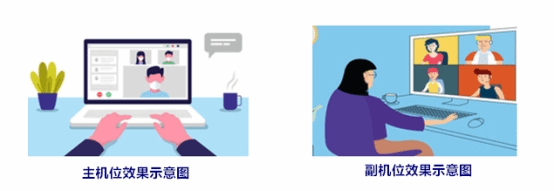 “双机位”标准:两设备相对而设,确保考生处于360度无死角状态。主机位安装腾讯会议,从正面拍摄,须同时开启音频、视频,设备放置在本人身前约30cm处,确保拍摄到本人上半身、表情、眼神、身后环境。副机位安装钉钉,仅开启视频,须关闭音频,在考试期间确保仅主机位传递音频,设备放置在侧后方约45°距离本人约30cm-80cm处,确保从考生身后完整拍摄到考生全身、主机位完整屏幕,副机位须可自由移动,考试过程中考生根据考官指令随时变换副机位位置,如遇主机位故障,考生须立即打开副机位音频完成考试。“双机位”效果图如下: