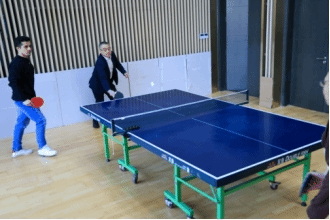 国球激情勇攀缘。乒乓球技切磋点燃了活动现场。以球赛叙情谊,国球的激情吸引了与会师生,他们迅速进入状态,直拍、横拍反复切换,搓球、拉弧旋球极限拉扯。对手队友相互切磋,承载了对新的一年健康快乐的期许。