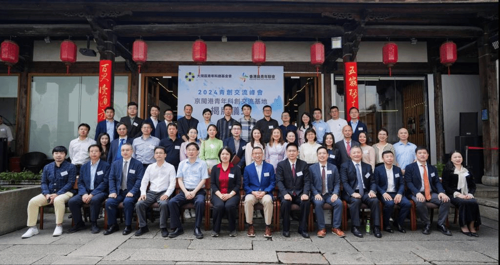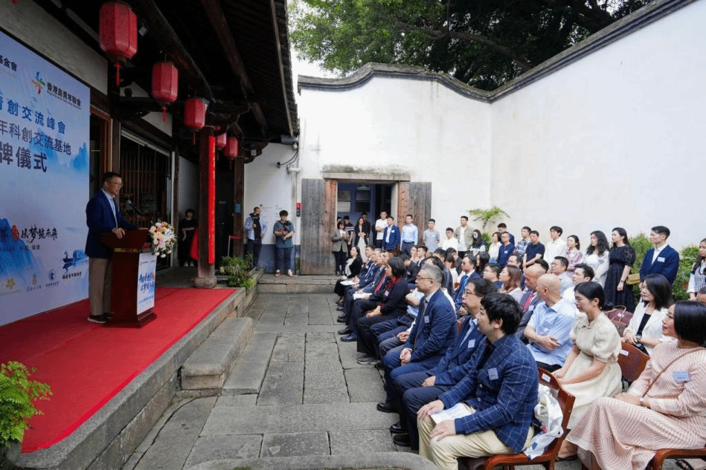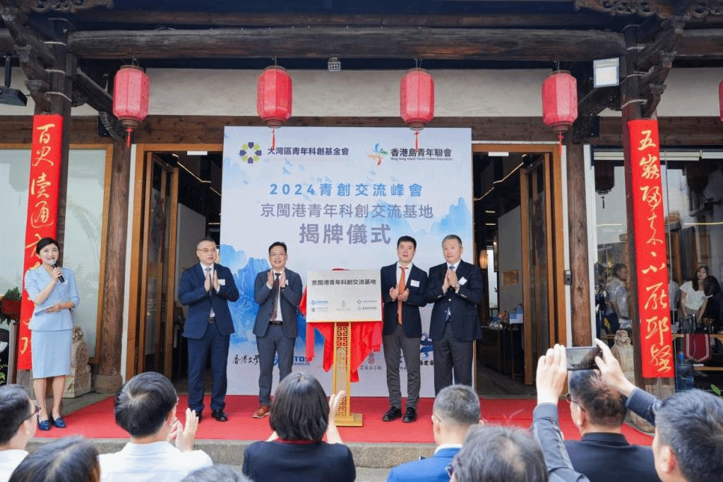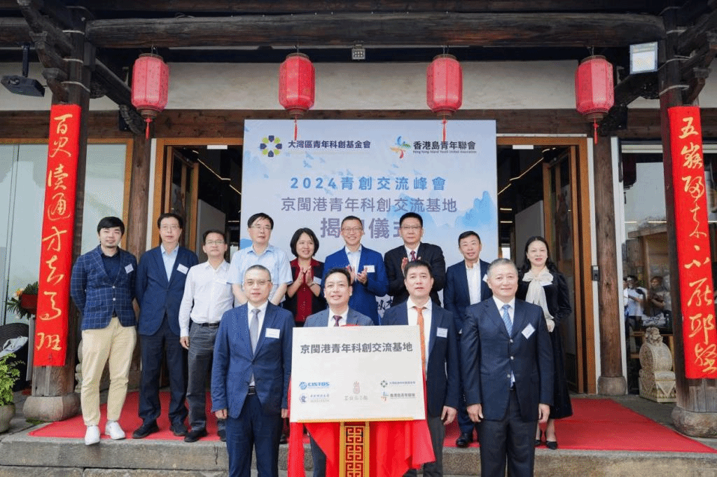 在主办方和主理嘉宾开幕致辞结束后,进入京闽港青年科创交流基地(青创基地)的揭牌环节,该青创基地由青创会、港岛青联、首科院、中财大国经贸公司以及严复翰墨馆共同发起设立,通过在福州三坊七巷严复翰墨馆挂牌设立青创基地,旨在便利后续常态化和定期化促进京闽港三地青年的科创交流。