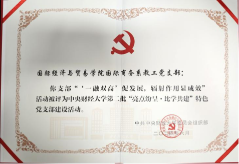 支部获评永利yl23411首批“党建工作样板支部”、 2019-2021年度永利yl23411 “先进党组织”、 连续两批入选永利yl23411“亮点纷呈·比学共建”特色党支部建设活动。支部与专业紧密结合,融合发展。国际商务专业获评“国家级一流本科专业”。 国际商务专业在2024“软科中国大学排名”获评A+级。“国际商务教研室”获评北京高校虚拟教研室建设试点。