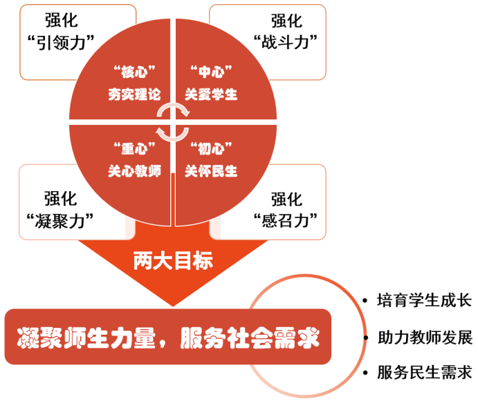 支部立足学科和专业特色,充分发挥支部同学博学善思、青春活力、具备国际视野、胸怀天下的优势,聚焦“凝聚师生力量”和“服务社会需求”两大目标,提出“萃四心、强四力”的工作框架:即以夯实理论为“核心”、关爱员工为“中心”、关心教师为“重心”、关怀民生为“初心”,持续强化支部的“引领力”“战斗力”“凝聚力”“感召力”,以构建融合教育、金融、社区资源的校银、校社高效协同的服务生态。