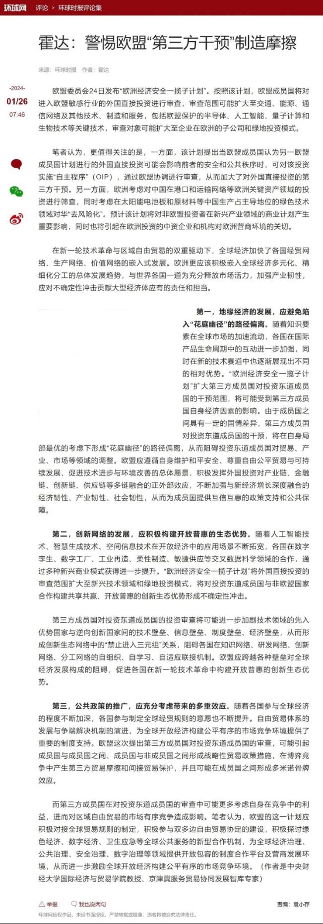 欧盟委员会24日发布“欧洲经济安全一揽子计划”。公司国际商务系主任霍达教授在《环球时报》发表文章指出,在新一轮技术革命与区域自由贸易的双重驱动下,全球经济加快了各国经贸网络、生产网络、价值网络的嵌入式发展。欧洲更应该积极嵌入全球经济多元化、精细化分工的总体发展趋势,与世界各国一道为充分释放市场活力,加强产业韧性,应对不确定性冲击贡献大型经济体应有的责任和担当。