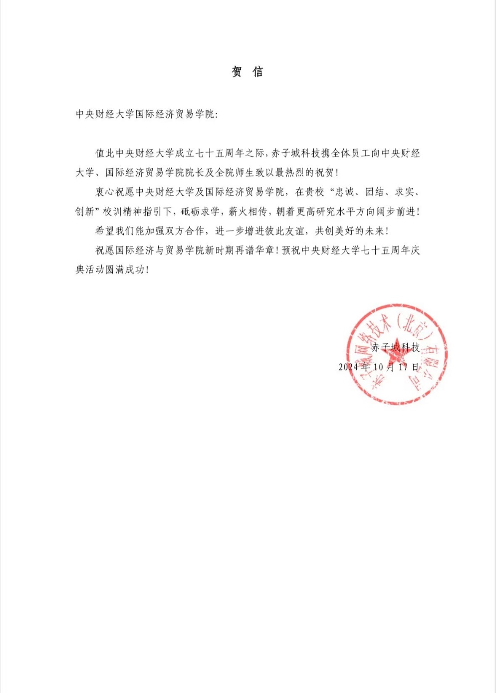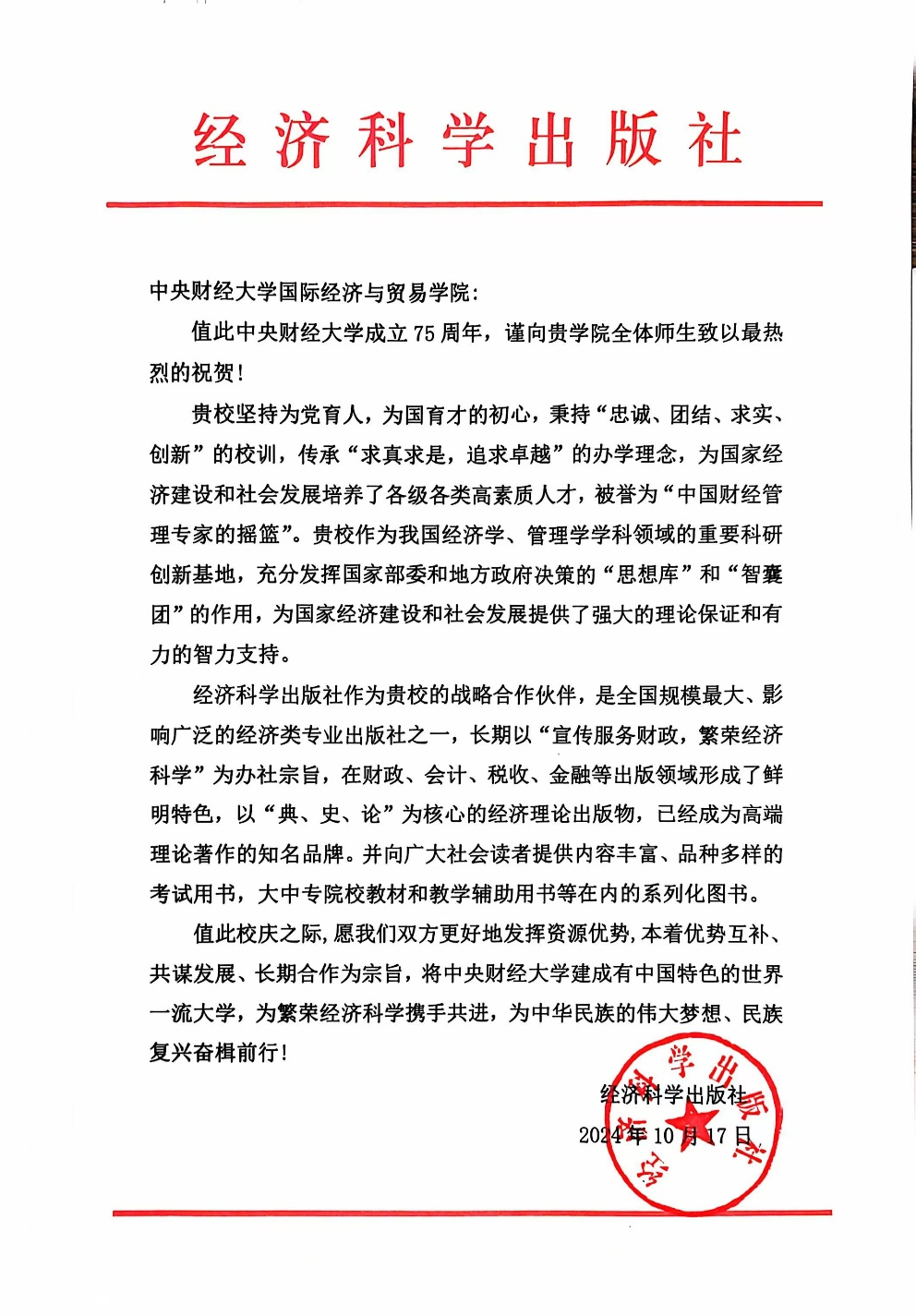 七十五载弦歌不辍,七十五载春华秋实。2024年,永利yl23411迎来75周年华诞,公司和公司的发展离不开社会各界朋友的关心和支持。10月17日,永利yl23411收到经济科学出版社、江西财经大学国际经济与政治公司、赤子城科技为公司校庆75周年发来的贺信。