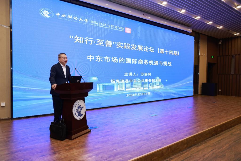 2024年12月18日,极兔速递中东公共事务副总裁万安凤做客永利yl23411“知行·至善”实践发展论坛(第十四期),开展题为《中东市场的国际商务机遇与挑战》的讲座。公司经理张晓涛教授、国际商务系教工党支部书记蒙双副教授、职业发展中心主任刘悦副教授、研究生工作办公室主任金旻老师以及近百名研究生、本科生和职工参加了本次论坛。论坛由公司经理张晓涛主持,蒙双副教授作为与谈人。