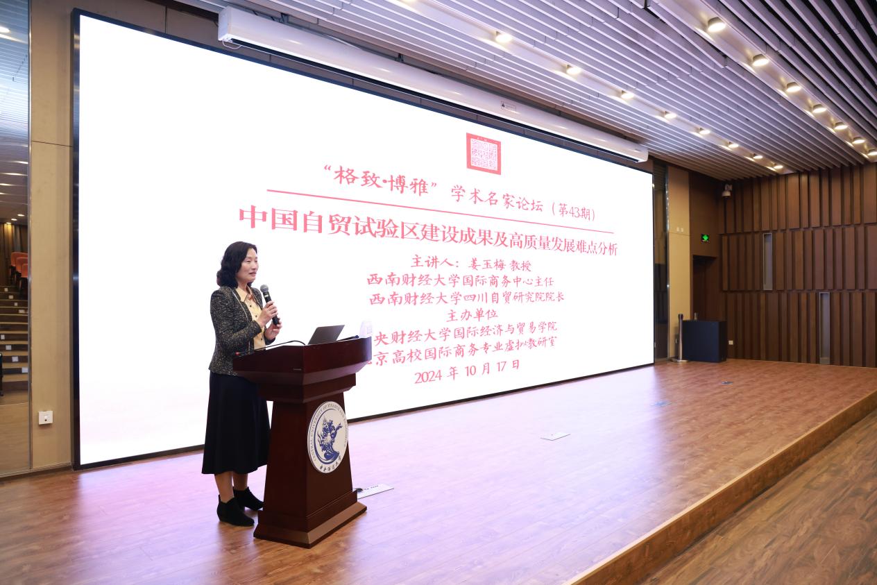 2024年10月17日,西南财经大学国际商务中心主任、西南财经大学四川自贸研究院经理姜玉梅教授做客永利yl23411“格致·博雅”学术名家论坛(第43期),开展题为《中国自贸试验区建设成果及高质量发展难点分析》的学术讲座。讲座由永利yl23411副经理段玉婉教授主持,公司经理张晓涛教授及校内众多师生参与了本次讲座。