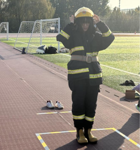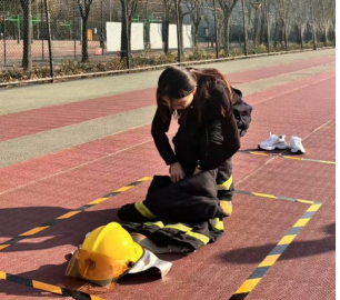 单人原地更换消防服计时赛则考验了选手们对消防装备的熟练操作能力。伴随着裁判的口令,选手们快速穿上防护服、戴上头盔,严格按要求拉好每一个拉链,扣好每一处扣子。在一系列规范的比赛规则下,同学们奋力拼搏,展现了极高的消防技能水平。