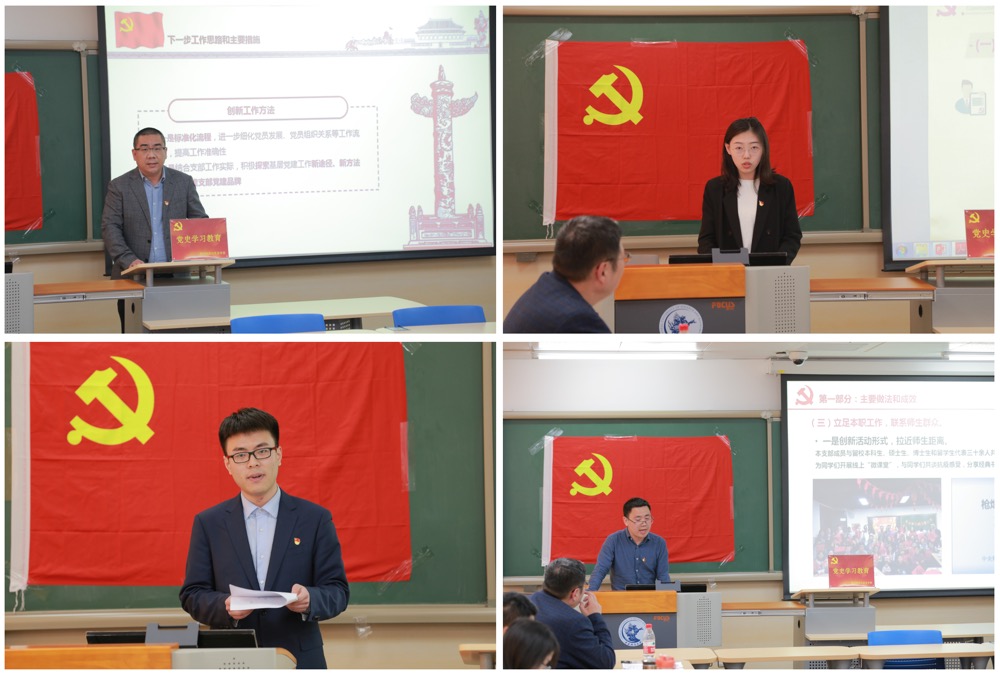 第一本科生党支部书记杨武、第二本科生党支部书记代杜昆昆、国际商务专业硕士研究生党支部书记袁镭桐、国际贸易系教工党支部书记梅冬州先后围绕各自支部党建工作的主要做法和成效、问题及解决措施、未来工作展望进行现场述职。