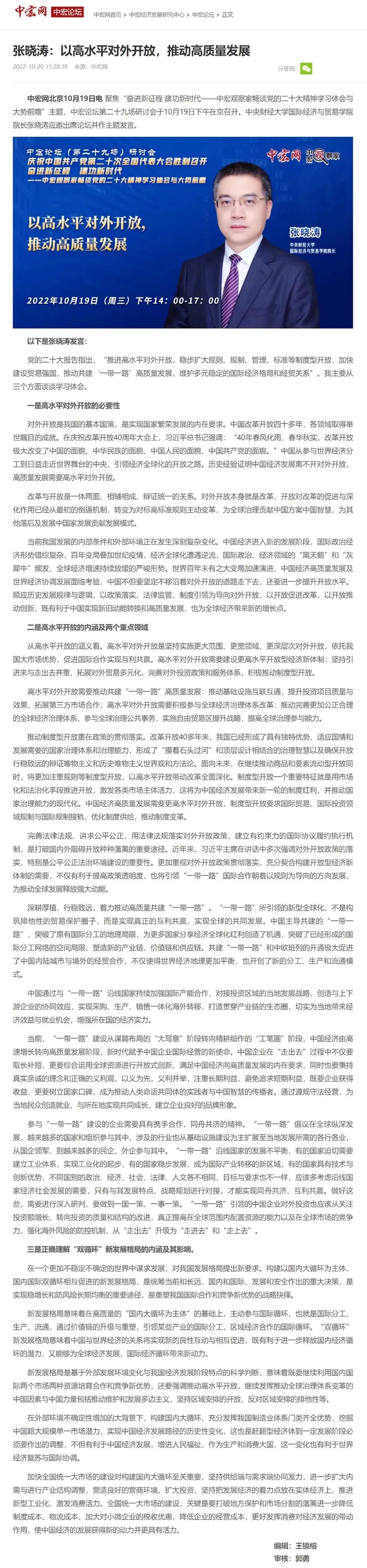 近期,中宏论坛第二十九场研讨会于10月19日下午在京召开,公司张晓涛教授应邀出席研讨会并围绕会议主题“聚焦‘奋进新征程 建功新时代’——中宏观察家畅谈党的二十大精神学习体会与大势前瞻”作题为《以高水平对外开放,推动高质量发展》的主旨发言。相关内容刊登在中宏网2022年10月20日刊。