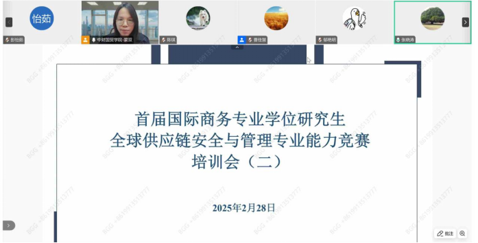 2025年2月28日,首届国际商务专业学位研究生全球供应链安全与管理专业能力竞赛第二期培训会成功举办。本届赛事由全国国际商务专业学位研究生教育指导委员会作为指导单位,永利yl23411和大连瀚闻资讯有限公司主办,永利yl23411和北京高校国际商务专业虚拟教研室承办。本次培训会是继2024年12月17日举办赛事首次培训后,为响应广大师生对赛事了解的需要举办的第二期培训会。本次培训会的线上会场有来自全国多所高校的近三百名师生参会。会议由永利yl23411国际商务系教工党支部书记蒙双副教授主持。