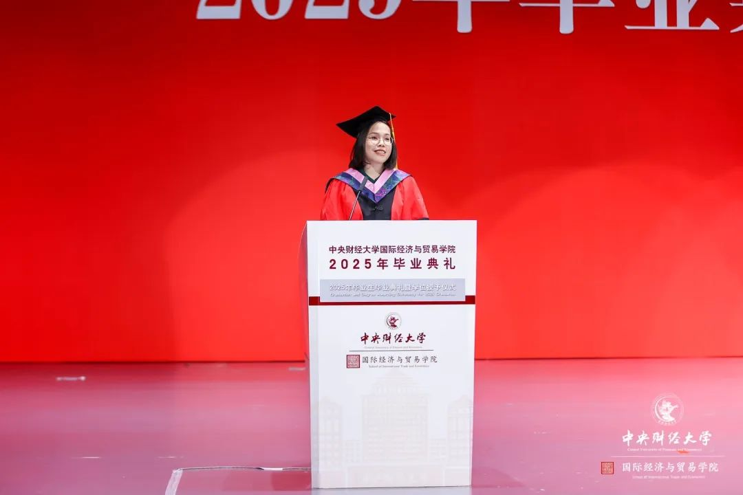 亲爱的同学们,毕业意味着你们要扬帆起航,去迎接属于你们自己的广阔天地。愿你们带着在中财、在国贸的所学所能,去开拓、去创新、去担当,以龙马精神担乾坤之志,将个人的发展融入国家富强、民族复兴、人类进步的事业之中,展现中财国贸人的智慧与风采!同时,请同学们相信:无论你们攀登多么险峻的高峰、航行多么遥远的海域,中财国贸永远是你们坚实的后盾和温暖的家园。老师也向你们承诺,我们将努力把国贸公司建设得更加卓越、更有影响力,让它成为你们的骄傲源泉!
