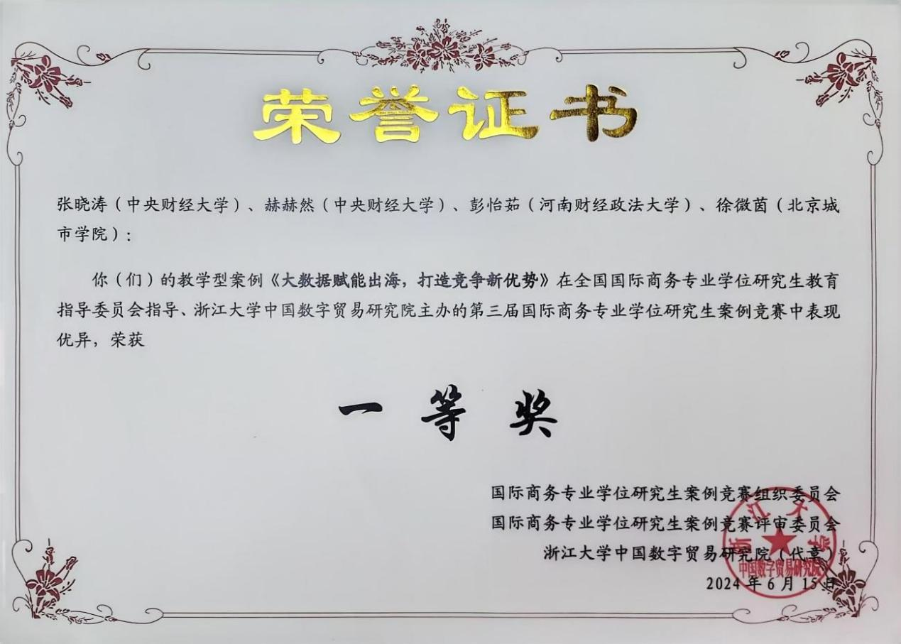 近日,由公司张晓涛教授担任首席专家的教育部2023年度主题案例项目《专精特新“小巨人”大作为,瀚闻资讯大数据赋能走出去》(编号:ZT-231003431)通过教育部学位与研究生教育发展中心评审,顺利结项。团队成员包括霍达教授、蒙双副教授、国际商务专业研究生赫赫然、彭怡茹等。该项目聚焦“走出去”主题,以专精特新企业大连瀚闻资讯有限公司(以下简称“瀚闻资讯”)为研究对象,解构瀚闻资讯与其上游信息来源以及下游服务对象形成的数字生态系统,研究其专有的智能系统和算法为“走出去”企业赋能的独特优势,深入剖析大数据平台如何赋能外贸企业突破国际化壁垒,为推进数字经济赋能贸易强国建设提供学术支撑和典型案例。