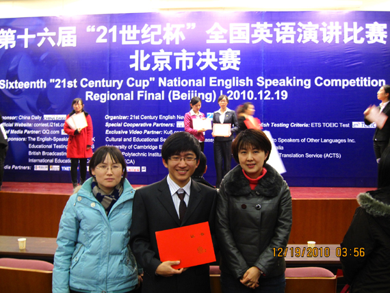 公司09级国际经济与贸易班李治同学在第十六届“21世纪杯”全国英语演讲比赛北京市决赛中,凭借引人入胜的演讲内容、流畅自然的演讲表达和高超娴熟的演讲技巧一举获得决赛一等奖。