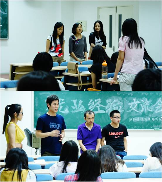 签约德勤的窦莹学姐首先发言,她认为大家在面临就业时要对就业地点和目标做好定位,要将80%的精力放在自己明确想去的就业目标上。同时她还为同学们介绍了四大的招聘流程,建议大家在面试四大时要提前多准备,要敢于说出自己的想法。签约中国石化华北分公司的马麟学长在起初找工作并不太顺利,他最多的时候一天曾投20多份简历,他告诫学弟学妹们在就业的过程中要充分做好准备工作,要以积极的心态去找工作。随后,签约于中信银行总行营业部的刘佩从应聘前,应聘中,应聘后三个方面讲述了求职过程中应注意的问题,她认为在应聘后应该总结每次面试的一些基本情况。肖美彦现签约于四大跨国粮商之一的路易达孚,她谈到同学们在应聘时要注意阐述在实习中学到的东西和需要改进的方面,而不仅仅是实习的内容。杜广哲签约了中国建设银行总行,他就同学们关心的北京户口问题做了重点说明,他认为国有银行和国有企业较容易为毕业生解决户口。杨措现签约于中国人民银行青海分行,她讲认为在就业的过程中要权衡自己的实力,不要给自己留有遗憾。杨海涛签约了中国建银投资,他最后发言并总结了2010级国贸公司研究生的总体就业情况,他提出在找工作的过程中态度要端正,并在这个过程中不断认识自我。