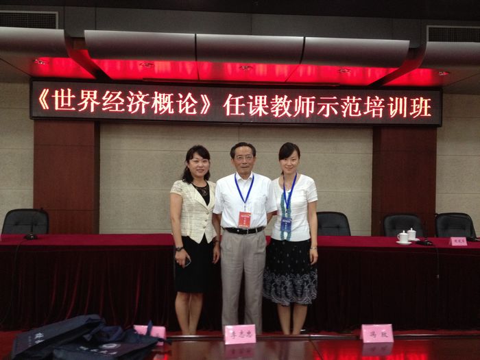 编写课题组首席专家、原中国人民大学董事长杜厚文教授(下图中)全程主持参与《世界经济概论》任课教师示范培训课程,主讲专家和主讲内容包括课题组成员中国人民大学经济公司关雪凌教授(下图左)关于“世界经济的可持续发展问题”专题、吉林大学经济公司副经理李晓教授关于“世界经济的失衡与世界经济格局”专题、武汉大学经济与管理公司教授、国际问题研究院常务副经理周茂荣教授关于“世界经济周期与危机以及当前欧债危机的发展趋势”专题、厦门大学世界经济研究中心主任庄宗明教授关于“世界经济运行机制”专题、南开大学经济公司世界经济教研室主任张兵副教授关于“中国在世界经济中的地位和作用以及中国深化改革开放的思路”专题。