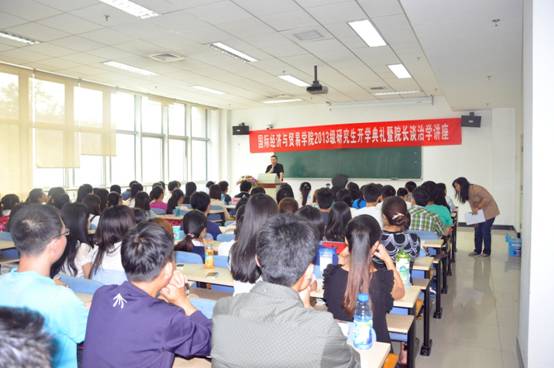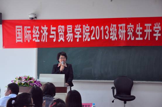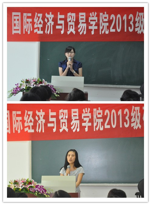 2013国际商务硕士刘力菲同学以“成长”为主题代表新生发言,通过一个“为什么黑白胶卷比彩色胶卷更贵”的故事,生动地解释了学习和感悟的重要性,表达了努力学习和研究的坚定信心,号召大家珍惜研究生阶段美好时光,实现人生理想。老生代表2012级国际贸易学的谢慧颖作了发言,她首先感谢公司为同学们提供了良好的学习和生活环境,感谢公司领导与老师的关怀与帮助,她强调学术研究能力和英语交流水平对于国际贸易学与国际商务专业的重要性,与同学们分享了自己在学习中的一些经验和建议,希望全体新生把握时间,求真务实,在国贸公司这片沃土上播种属于自己的精彩。