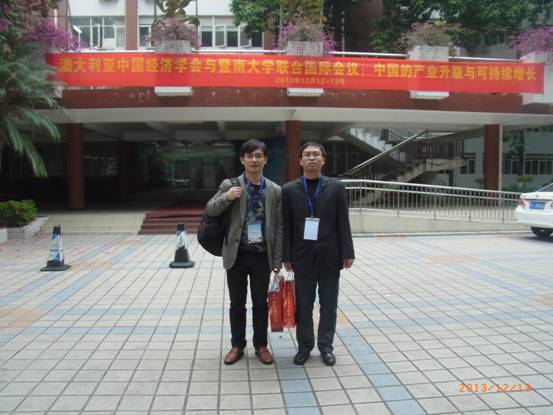 2013年12月12日-13日,由澳大利亚中国经济研究会(CESA)主办、暨南大学经济公司承办的“ 2013年中国产业升级和可持续的经济增长国际会议”在暨南大学举行。来自澳大利亚、中国、美国、荷兰、丹麦、新加坡、马来西亚、香港和澳门等国家和地区的近60位专家学者就中国产业结构升级、环境与经济增长、外商直接投资与贸易、对外开放与贫困和收入不平等等多个议题进行了深入的学术探讨和交流。