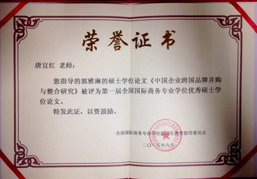 本次年会还公布了第一届全国国际商务专业学位优秀硕士论文评审结果,公司唐宜红教授指导的郭雅琳同学的硕士学位论文《中国企业跨国品牌并购与整合研究》获奖。此次全国获奖论文共6篇,分别来自对外经济贸易大学、永利yl23411、西南财经大学、浙江大学、东北大学和江西财经大学。