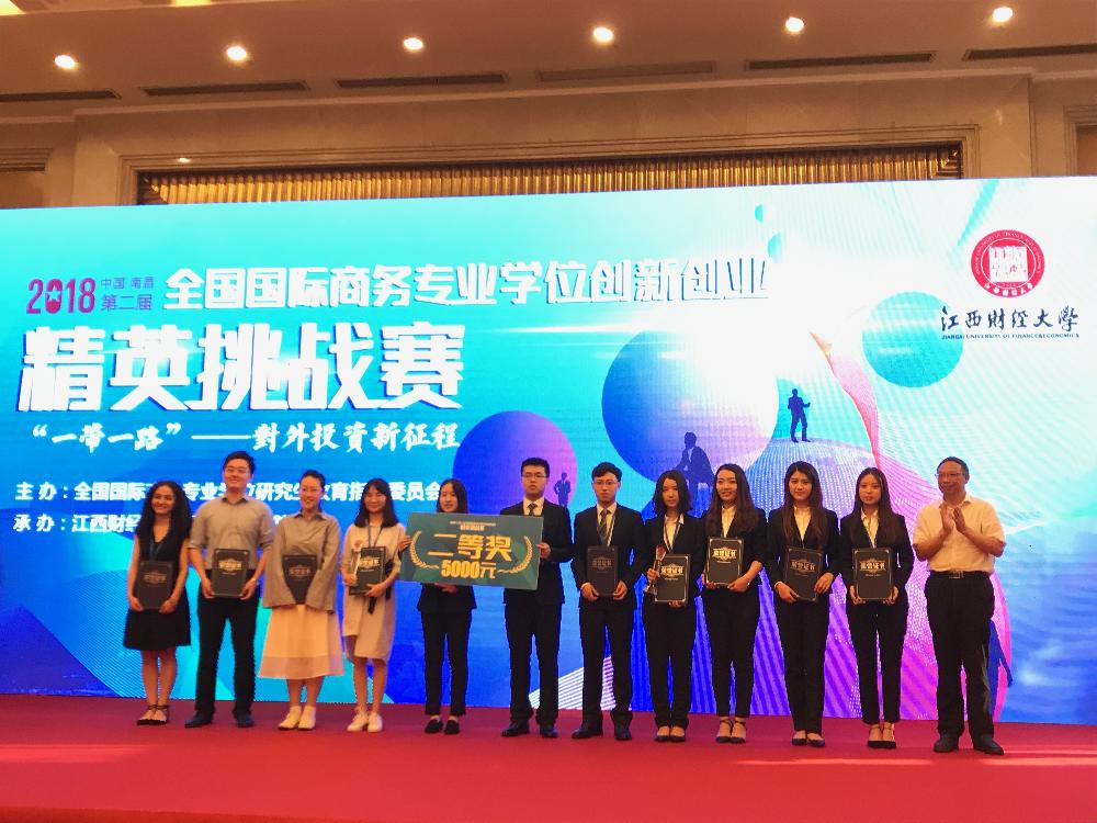2018年5月23日至25日,由全国国际商务专业学位研究生教育指导委员会主办,江西财经大学国际经贸公司承办的“第二届全国国际商务专业学位创新创业精英挑战赛”在江西南昌举行,本次比赛主题是“一带一路:对外投资新征程”。由公司副经理符大海副教授带队,分别由2017级硕士研究生徐平(队长)、许家齐、葛亮、尹凯麒、张夏、詹慧文(指导老师:霍达)和宫雪(队长)、冯依彤、邢钰锋、鲁成浩、侯瑞、常荣平(指导老师:符大海)组成的两支代表队参加了决赛,最终夺得一等奖、最佳风采奖和二等奖的优异成绩,从而公司成功卫冕了该项赛事。