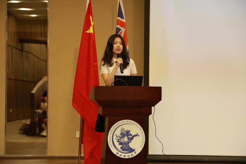 随后,2016级中澳班的徐臻同学代表中澳合作项目高年级员工,与2018级新生分享了自己的思考与感悟。她首先祝贺所有新生能来到心仪的大学,开始人生新的旅程。她认为,当今世界经济面临诸多挑战,中美贸易战持续升级,中国经济进入新常态,这些都需要我们年轻一代肩负起时代的使命。她建议师弟师妹能充分利用中澳项目的优势资源,在优秀老师的带领下畅游知识海洋,不断挑战自我、超越自我。