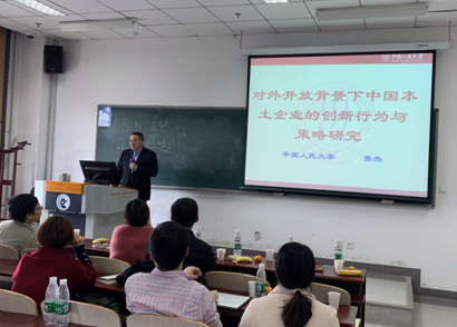 在下午的论坛中,来自中国人民大学中国经济改革与发展研究院的张杰教授为大家介绍了近期自己在对外开放背景下对中国本土企业的创新行为与策略的研究。在全球化开放背景下,对于那些技术创新水平处于相对落后状态的发展中国家而言,既可以通过促进本土企业创新研发投入增加策略,来促进自主创新能力的提升,更可以通过对发达国家的对外技术引进或购买行为,利用发达国家的相对先进技术,通过技术创新的溢出效应、学习效应和转移效应,来弥补发展中国家自身自主创新能力的相对不足,促进发展中国家本土企业自主创新能力的提升,进而逐步获得推动自身经济可持续增长的基础条件。这表明,科学验证和辨别对外开放背景下中国本土企业的诸多典型创新行为特征与决策策略研究,并且揭示其中的作用机理,必然是事关发展中国家经济增长领域的重大问题和前沿问题。此外,张杰教授还与大家分享了自己的论文《对外技术引进与自主创新——中国的事实及理论》。文章利用全国创新调查企业数据库,将企业的创新行为分为内部创新与外部创新进行研究,并从理论和实证两个层面讨论了对外技术引进活动对中国本土企业自主创新活动的影响。文章创造性构造了一个政策指标作为工具变量,很好解决了潜在内生性问题。