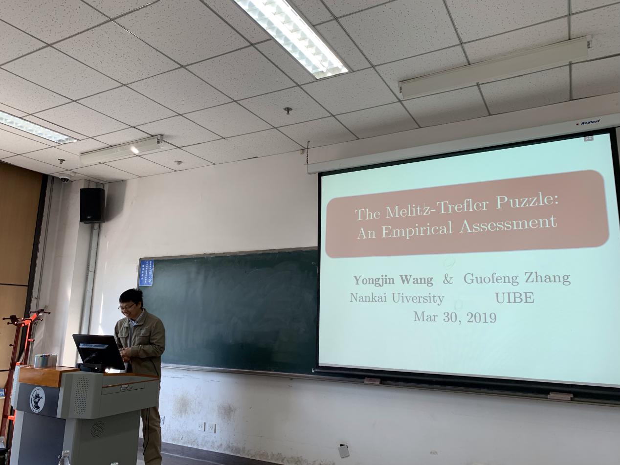 首先,来自南开大学的王永进教授宣讲了他最新的研究成果“The Melitz-Trefler Puzzle: an Empirical Assessment”。文章从理论上梳理了贸易自由化对行业生产率影响的作用机制,将行业生产率增长分解为两个效果,一个是“选择效应”,另一个是“位移效应”,并利用中国工业企业数据库,考察了中国加入WTO后不同行业的生产率变化,结果显示中国行业生产率增长主要来自于“位移效应”,而不是“选择效应”。