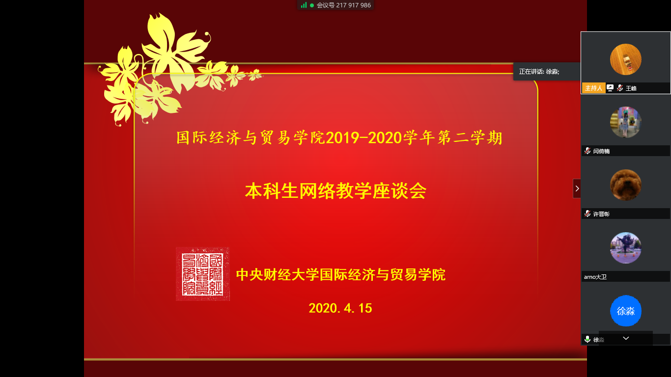 为进一步完善网络教学,提高网络教学质量,4月15日下午,永利yl23411通过腾讯会议平台,组织召开三场本科生网络教学座谈会。国际贸易系座谈会由公司党委书记徐淼老师主持,国际贸易系主任张艳老师、教学科研管理办公室王峰老师、国际合作办公室闫倩楠老师,国际经济与贸易专业各班(含职工)、经济与贸易类19-1班等员工代表参加了座谈。