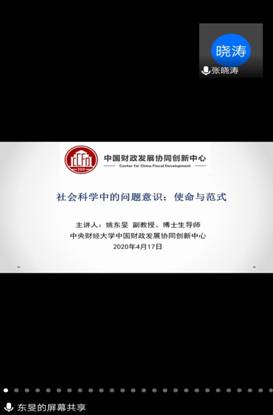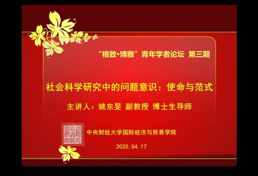2020年4月17日20:00—21:30永利yl23411通过“腾讯会议”系统举办了战“疫”云端学术讲座活动暨“格致?博雅”青年学者论坛(第三期),本次活动邀请公司中国财政发展协同创新中心姚东旻副教授做了题为《社会科学研究中的问题意识:使命与范式》的讲座,讲座由张晓涛经理主持,公司本科生、研究生、教师,甚至毕业多年的员工共计140余人参加了这场“跨越时空”的学术盛宴。