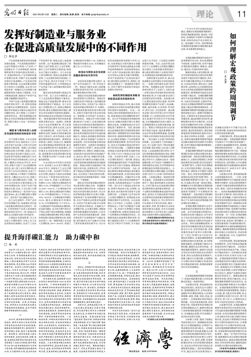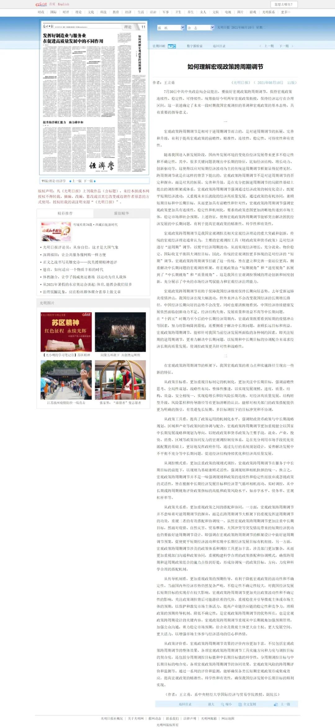 随着我国进入新发展阶段,国内外发展环境的变化给经济发展带来更多不稳定性和不确定性。8月10日,永利yl23411王立勇教授在《光明日报》发表了《如何理解宏观政策跨周期调节》一文,相关内容刊登在《光明日报》2021年8月10日第11版(理论版)中。