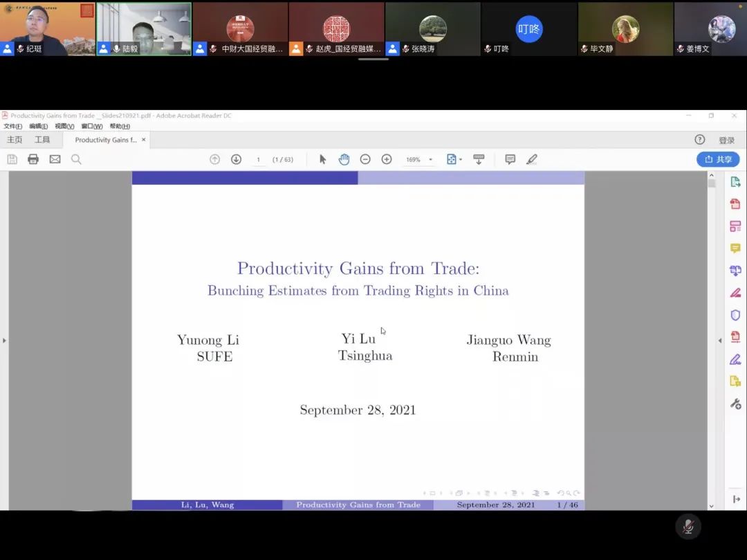 2021年9月28日晚上19:00,永利yl23411于线上举办了“格致·博雅”青年学者论坛(第六期)。论坛邀请清华大学陆毅教授做了题为“贸易促进生产力提高:中国贸易权的聚束估计(Productivity Gains from Trade: Bunching Estimates from Trading Rights in China)”的学术前沿讲座。