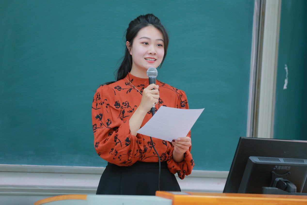 赵心然同学分享了自己在中财大读书的感受以及前往贫困地区支教的体会。她提到所有的经历都让她深刻地体会到了自身使命的重大,也让她深深地意识到了中财大人的优秀。她提出在新征程的起点上,在研究生学习生活的起跑线上,我们要传承中财大“为国而生,与国同行”的红色基因,以专业所学实现报国之志。