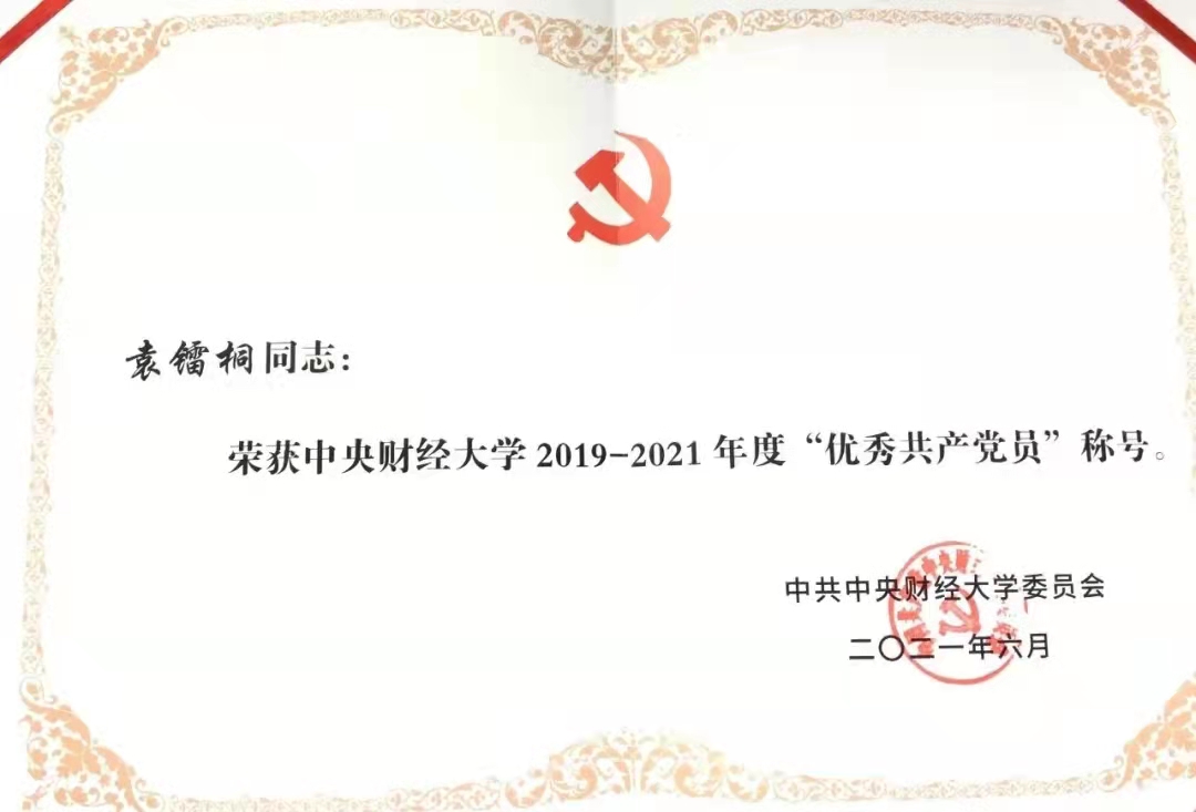 袁镭桐荣获2019-2021年度校级“优秀共产党员”荣誉称号先进事迹