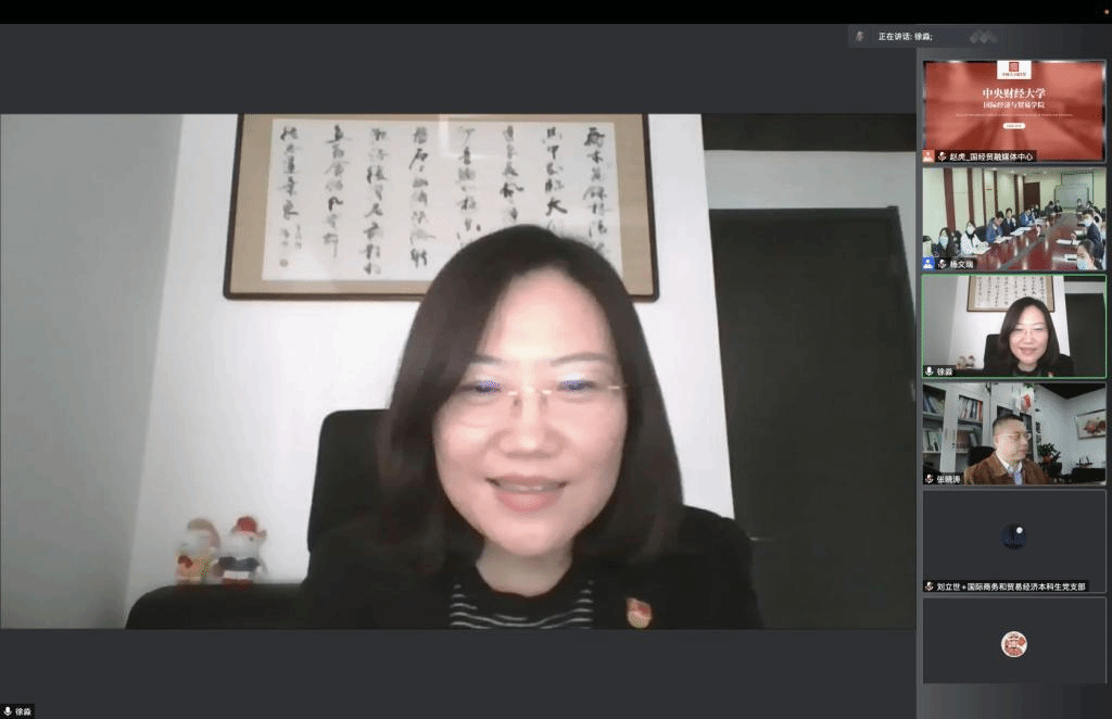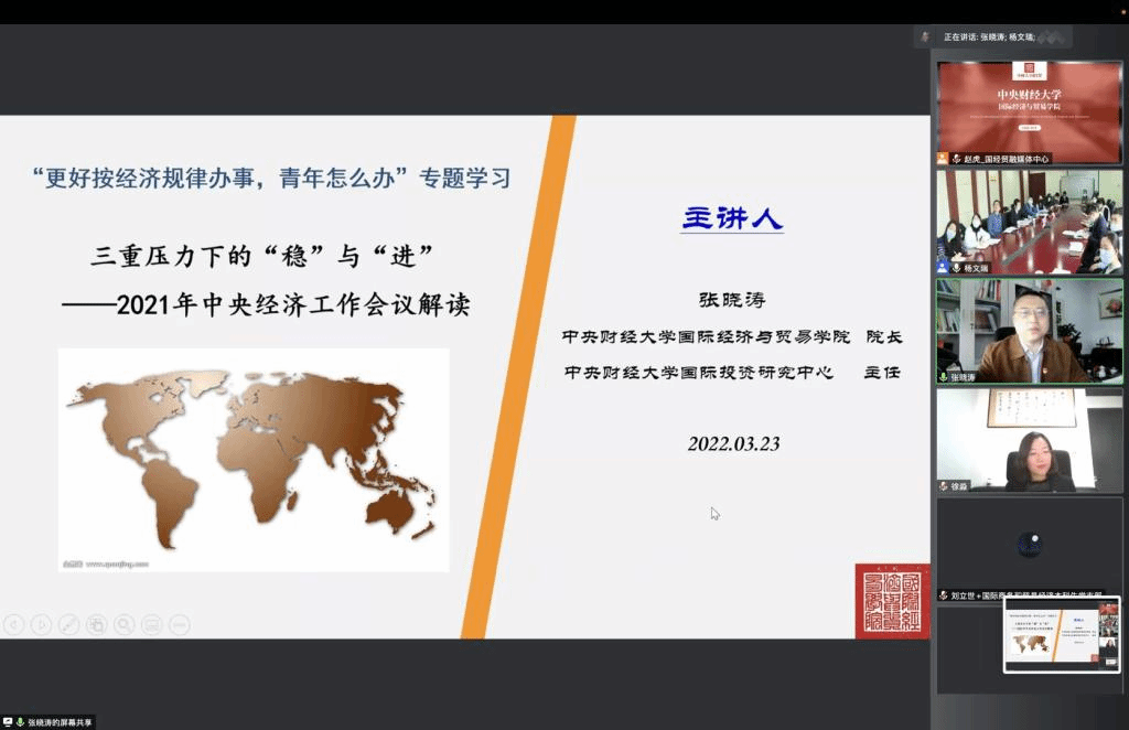 为深入学习习近平新时代中国特色社会主义思想特别是习近平经济思想,引导青年干部、党员不断提高政治判断力、政治领悟力、政治执行力,自觉从政治角度看待经济社会发展问题,完整、准确、全面贯彻新发展理念,3月23日下午,永利yl23411公司党委理论学习中心组(扩大)联合财政部科教文司青年理论学习小组开展专题学习研讨活动。在做好疫情防控工作的前提下,双方以“更好按经济规律办事,青年怎么办”为主题,通过线上视频的形式开展此次联学活动,深入学习习近平总书记在2021年中央经济工作会议上的重要讲话精神,正确认识和把握四条规律性认识、七个方面政策取向、五个重大理论和实践问题。财政部科教文司党总支书记、司长黄家玉同志,永利yl23411公司党委书记徐淼、经理张晓涛教授出席活动并讲话,财政部机关团委书记岳林应邀参加此次活动,永利yl23411公司党委理论学习中心组、各支部书记、国际商务和贸易经济本科生党支部全体党员同志及科教文司全体青年干部参加了此次活动。