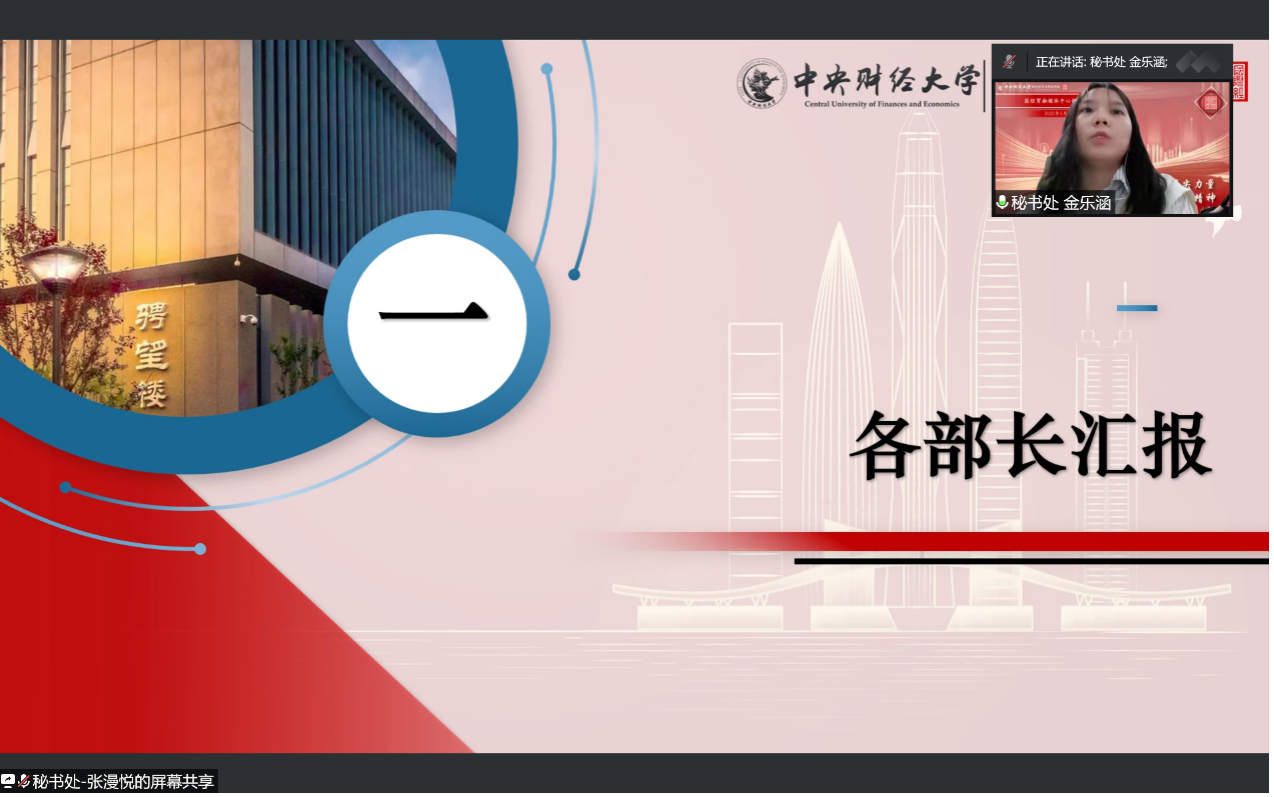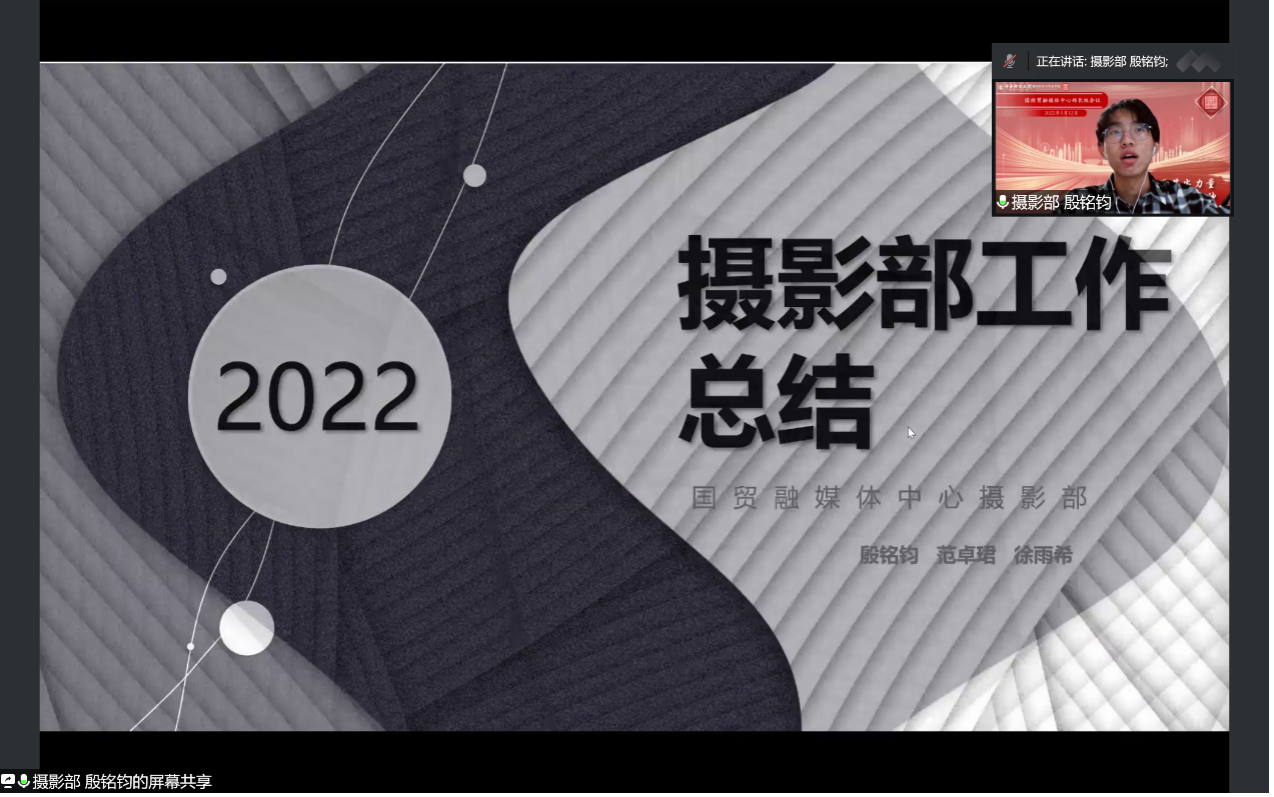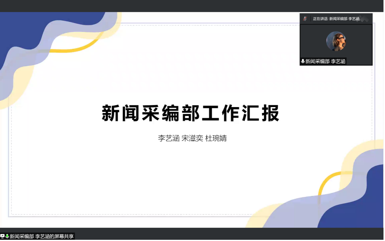 会议上,部长团和主任团成员对部门本学期已完成工作进行总结。视频部、摄影部、设计部 、秘书处、新闻采编部等部门依次对本月工作进行了汇报。在回顾了前期工作同时,也积极总结经验,对现存问题及线上工作所遇瓶颈有针对性地提出改进措施,并展望未来部门工作及换届筹备工作,争取承接好融媒体矩阵最后一棒。