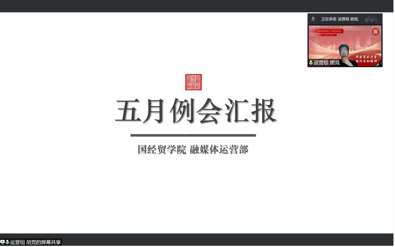 展现国贸风采,助力融媒发展。5月12日晚18:30,永利yl23411融媒体中心“传递笔尖力量,践行求知精神”部长级会议于线上召开。公司经理张晓涛,院融媒体中心指导老师赵虎,融媒体中心主任及部长团成员出席此次例会。会议由赵虎主持。