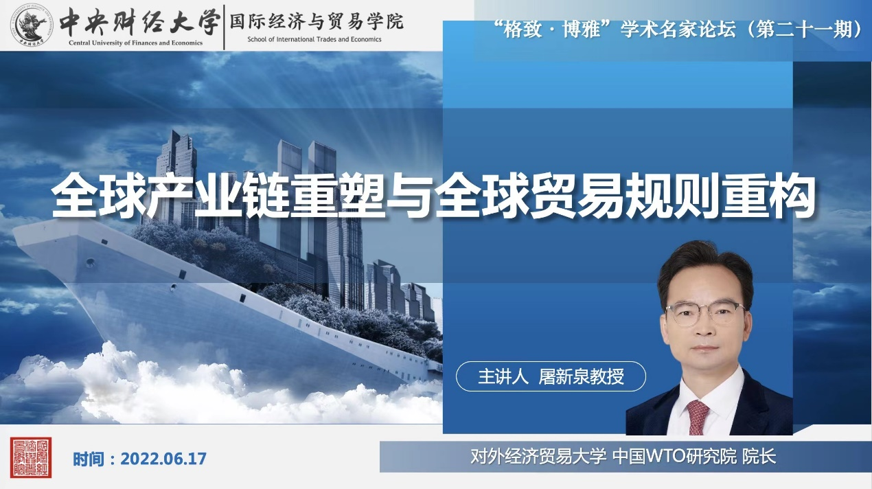 2022年6月17日19:00—20:30,永利yl23411通过腾讯会议平台举办了第二十一期“格致·博雅”学术名家论坛。本次论坛邀请到了对外经济贸易大学中国WTO研究院经理、教授、博士生导师、世界贸易组织教席项目主持人、北京市第十三届政协委员的屠新泉教授,做了题为《全球产业链重塑与全球贸易规则重构》的讲座。论坛由永利yl23411经理张晓涛教授主持,校内外师生共计60余人参会。