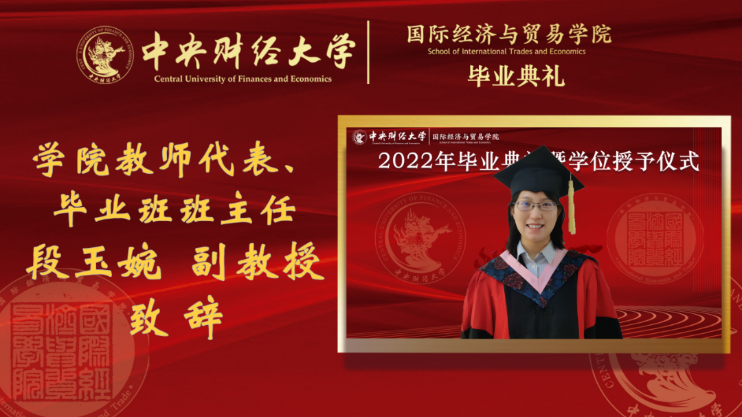 我是中财国贸的一名专任教师,也是18级国际经济与贸易专业的班主任,非常荣幸能作为教师代表在毕业典礼上发言。六月是一个收获幸福、种下希望的美好时节;六月的今天,我们云上相聚,共同庆祝同学们学有所成、顺利毕业。在此,请允许我代表各位老师向全体毕业生表示热烈的祝贺,向关心支持你们的家人朋友们表示衷心的感谢。