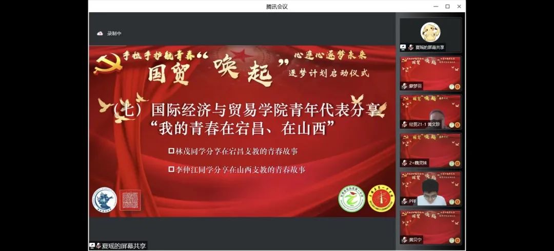 来自国际商务专业硕士研究生党支部书记林茂、国际贸易学硕士研究生党支部书记李仲江分享了他们在宕昌、石楼支教一年的青春故事。这短短的一年支教时光,不仅丰富了自己个人经历,更是切身参与脱贫攻坚战斗、服务社会莘莘学子、实现个人人生价值的宝贵征程。来自甘肃省宕昌县第一中学与山西省石楼县第一中学的员工代表李宏伟和刘珈玉同学则以肺腑之言回顾了与林茂、李仲江两位小老师相处的难忘画面。他们纷纷表示,支教老师结合自身成长经历和先进的教学理念,不仅让教材“活”起来,让课堂生动起来,更是点亮了员工们奔赴理想的希望,成为了孩子们的青春榜样力量。