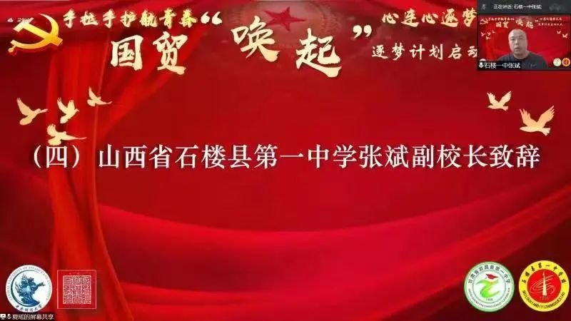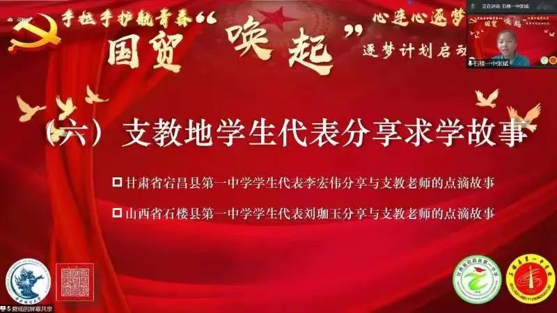公司党委书记徐淼老师首先代表公司致辞,她衷心感谢了宕昌县尚家湾村党支部、宕昌一中、石楼一中对历届研究生支教团同学一直以来的指导和照顾。徐淼书记表示,“一年支教行、一生支教情”,这不仅是支教团同学人生中浓墨重彩的一笔,更是三校间情谊的缘起。近年来,公司党委为助力脱贫攻坚和乡村振兴,发挥公司专业特色、汇聚公司师生力量,采用募集捐款、进行实地走访、对点支教等多种形式,用“党建红”点亮乡村“振兴梦”,助力宕昌县乡村振兴及各项事业的发展。“唤起”逐梦计划正是在这样的背景下,由国贸优秀学子发起,并在公司党委指导支持下,师生党员策划数月,以精准捐助和智育相扶的方式,助力宕昌一中和石楼一中的“图书角”与“运动场”建设,唤起更多中财青年志愿奉献精神和支教地少年的勇敢逐梦信念 。为此,徐淼书记向国贸青年党员、团员和入党积极分子等同学提出了三点希望,即加强思想政治学习,不断增强理想信念;打牢坚实专业基础,提升专业本领素养;传承志愿奉献精神,努力促进社会进步。最后,徐淼书记预祝国贸“唤起”逐梦计划顺利开启;祝福两所友校的老师们桃李芬芳,同学们学业进步;祝福三员工谊长存,彼此守护,静待花开。