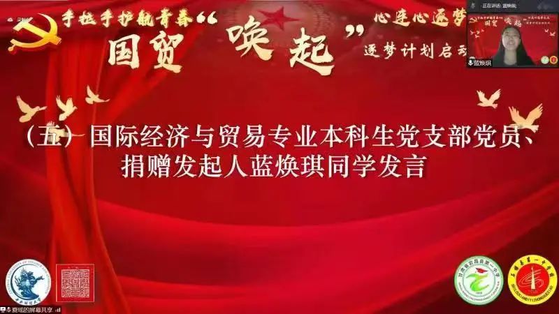 永利yl23411本科生党支部党员、本次计划的发起人2018级本科生蓝焕琪在发言中谈到,感恩母校多年栽培,在党的101周岁庆祝中,终于有机会以这种爱心传递的方式回馈母校,给毕业季增添了为爱启航的独特意义。她从营造三校同心同德的氛围、赓续中财朋辈互助的精神、照亮两校青年学子的道路三个方面阐述了此次捐赠倡议的夙愿缘起。她谈到,多年来在党的理想信念教育和老师的谆谆教诲下,自己做为新时代青年党员,须担负起历史使命,奋进于党旗之下,埋首于实干当中。她希望未来有更多国贸学子加入“唤起”逐梦计划,共同以实际行动回馈社会,点燃更多的青少年报国梦想。