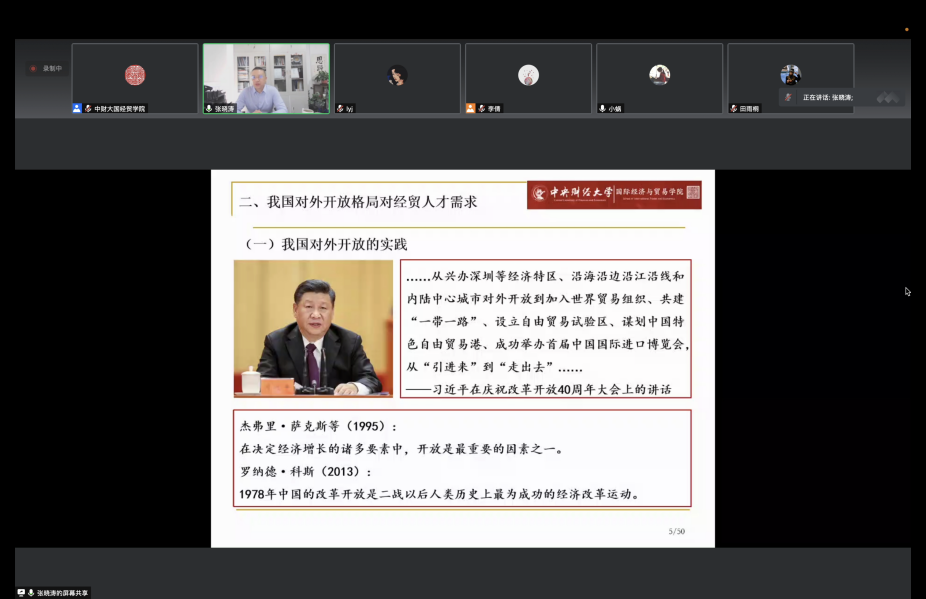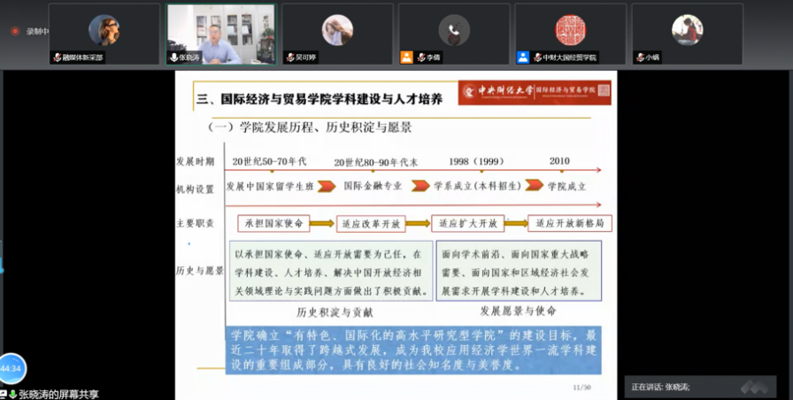 为引导新生坚定“四个自信”,树立远大目标,深入了解公司团队建设与人才培养情况,尽快适应老员工活,9月5日上午永利yl23411经理张晓涛老师通过线上直播,以“贸易联通世界,中财成就梦想”为题,为2022级本科新生带来新生入学教育“经理第一课”。2022级全体本科生及辅导员参加了本次会议。