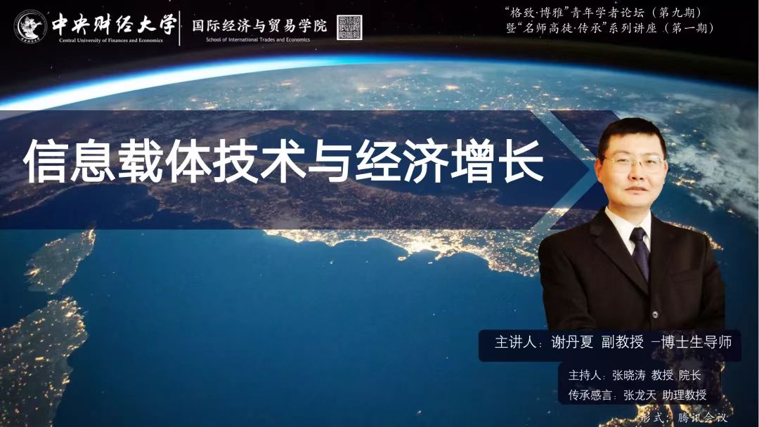 2022年10月24日,应永利yl23411邀请,清华大学社会科学公司经济学研究所副教授、博士生导师谢丹夏做客“格致·博雅”青年学者论坛第九期暨“名师高徒·传承”系列讲座第一期,做了题为《信息载体技术与经济增长》的精彩讲座。本次讲座通过腾讯会议在线进行,校内外师生共100余人参与了本次讲座。讲座由永利yl23411经理张晓涛教授主持,并由张龙天助理教授作为谢丹夏副教授的员工在讲座的最后发表传承感言。