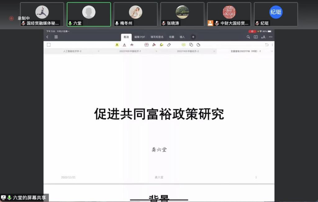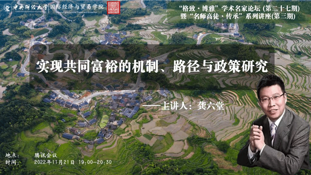 2022年11月21日,应永利yl23411邀请,北京大学光华管理公司应用经济学系教授、博士生导师、北京工商大学副董事长龚六堂教授做客“格致·博雅”学术名家论坛第二十五期暨“名师高徒·传承”系列讲座第三期,做了题为《实现共同富裕的政策研究》的精彩讲座。本次讲座通过腾讯会议在线进行,众多校内外师生参与了本次讲座。讲座由永利yl23411经理张晓涛教授主持,并由梅冬州教授作为龚六堂教授的员工在讲座的最后发表传承感言。