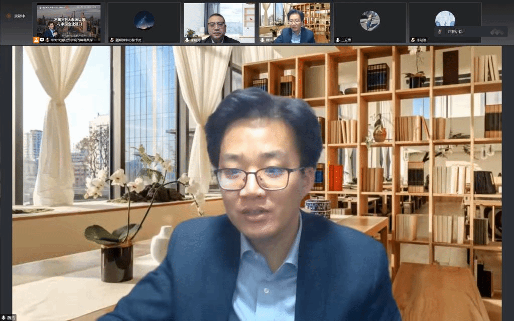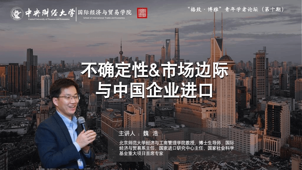 魏浩教授在讲座中介绍了自己的一篇工作论文,该论文使用经典的测度方法、翔实的数据和严谨的论证,对不确定性、市场边际与中国企业进口之间的关系进行了全面系统的阐述。首先,魏浩教授介绍了论文研究的背景:不确定性上升正逐渐成为中国进口企业面临的最大风险。同时,进口是连接国内循环与国际循环的重要枢纽和关键节点,是保障国内产业链供应链稳定和安全的重要环节。国家政府反复强调积极扩大进口的重要意义,积极扩大进口已经成为国家重大战略。进口市场组合调整是企业优化进口市场国际布局的重要方式,是应对不确定性冲击的有效手段,在化解重大风险、促进进口增长方面具有十分重要的作用。因此,为了更好地应对不确定性,确保进口持续增长,有必要从进口市场视角对进口增长进行结构性的分解,考察进口来源地不确定性对企业进口市场边际的影响效应和渠道,探究不确定性影响企业进口增长的深层原因和路径机制。