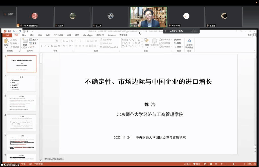 2022年11月24日下午16:00-17:30,永利yl23411通过腾讯会议举办了“格致·博雅”青年学者论坛(第十期),北京师范大学经济与工商管理公司魏浩教授为师生做了题为《不确定性、市场边际与中国企业进口》的精彩报告。本次论坛由永利yl23411副经理王立勇教授主持,校内外师生120余人参会。