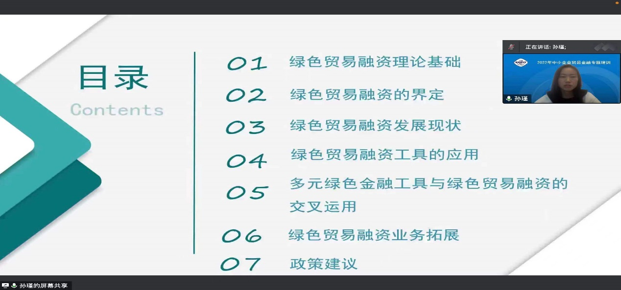 鉴于永利yl23411孙瑾在绿色贸易融资领域的研究成果,孙教授受邀为本次贸促会培训做《绿色贸易融资在中小企业国际化经营中的应用与实践》专题讲座。下午两点讲座开始,孙瑾教授共分八个部分为直播间4万多位企业家进行了详细讲解:首先,第一部分孙教授基于在国际组织ITC(International Trade Center)中小企业贸易融资部的项目经历,讲述了为中小企业贸易融资搭建桥梁的国际经验和经典案例;其次,第二部分是绿色贸易融资理论基础,基于绿色发展、绿色贸易和绿色金融交叉领域展开;第三部分是绿色贸易融资的界定,孙教授基于自己多年研究进行了初步界定并分析了绿色贸易融资的驱动因素;第四部分是绿色贸易融资发展现状,以中国石油国际事业有限公司在英国完成首单绿色贸易融资为案例进行详细介绍,指出发展前景;第五部分是绿色贸易融资工具的应用,以上海浦发银行国际碳保理融资和棕榈油可持续装运信用证为例进行介绍;第六部分是多元绿色金融工具与绿色贸易融资的交叉运用,主要介绍了绿色信贷、绿色债券、绿色保险与绿色贸易融资的前沿交叉应用;第七部分是绿色贸易融资业务拓展,简要介绍了离岸贸易融资和技术驱动普惠型贸易融资的未来发展;第八部分给出政策建议。