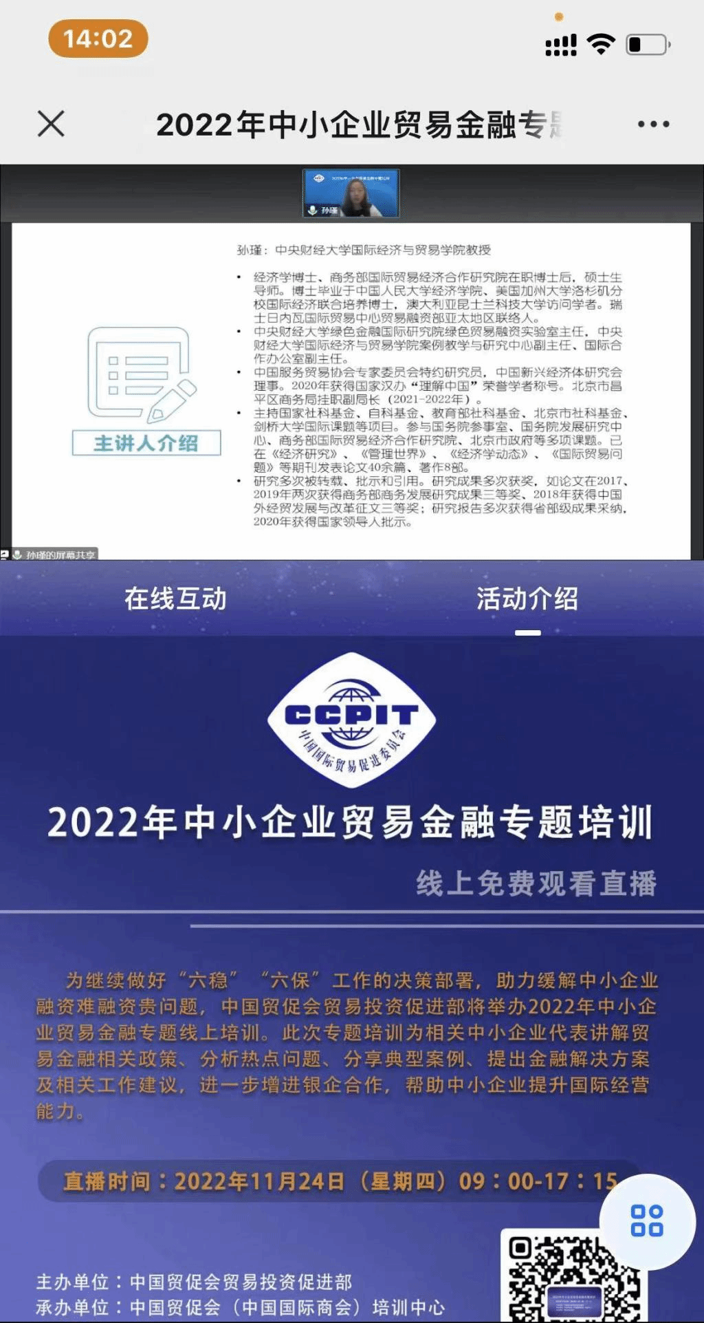 2022年11月24日,由中国贸促会贸易投资促进部主办、中国贸促会(中国国际商会)培训中心承办的“2022年中小企业贸易金融专题培训”线上召开,此次专题培训为相关中小企业代表讲解贸易金融相关政策、分析热点问题、分析典型案例、提出金融解决方案及相关工作建议,助力缓解中小企业融资难融资贵问题、做好“六稳”、“六保”工作的决策部署。