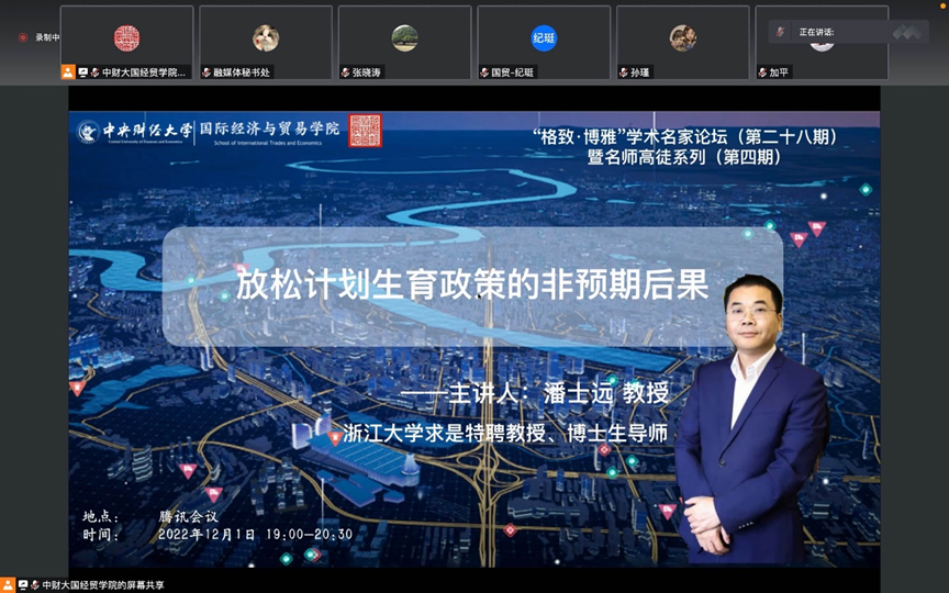 2022年11月21日,应永利yl23411邀请,浙江大学求是特聘教授、博士生导师潘士远做客“格致·博雅”学术名家论坛第二十八期暨“名师高徒·传承”系列讲座第三期,做了题为《放松计划生育政策的非预期后果》的精彩讲座。本次讲座通过腾讯会议在线举行,众多校内外师生参与了本次讲座。讲座由永利yl23411经理张晓涛教授主持,并由蒋海威助理教授作为潘士远教授的员工在讲座的最后发表传承感言。